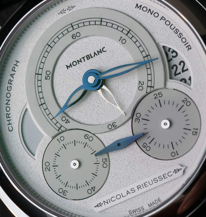 請注意,萬寶龍向尼古拉斯·凱世 (Nicolas Rieussec) 致敬的版本的計時碼表讀數略有調整。從一開始,萬寶龍 Nicolas Rieussec 手表就采用圓盤與指針來指示計時讀數。一切都沒有改變,但你閱讀信息的地方已經移到了一邊,沿著雙倍大小的藍鋼指針。