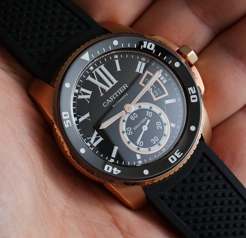 當(dāng)卡地亞 (Cartier) 正式推出卡地亞 Calibre Diver (卡地亞 Calibre Diver) 腕表時(shí),aBlogtoWatch 于 2014 年初在這里進(jìn)行了親身體驗(yàn)。在那里您可以看到精鋼版本和 18k 玫瑰金版本的實(shí)際操作圖像。明明是運(yùn)動(dòng)手表,我們?yōu)槭裁匆獙彶辄S金版?嗯,首先,我覺(jué)得黑色表盤(pán)搭配玫瑰金表殼很醒目,其次,我覺(jué)得既然是一款奢華的生活方式運(yùn)動(dòng)表,為什么不把奢華的元素發(fā)揮到淋漓盡致呢。