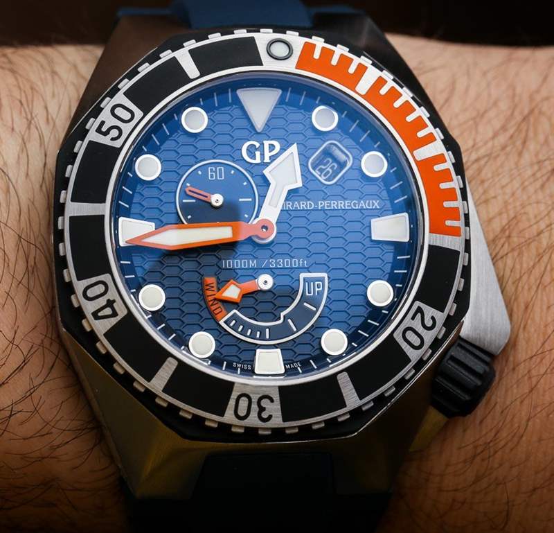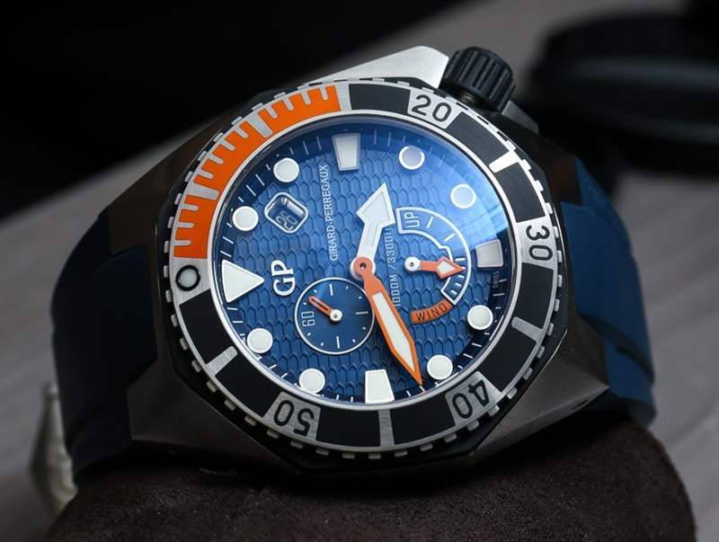Girard-Perregaux Sea Hawk 表殼采用鋼材制成,尺寸為 44 毫米寬,但考慮到寬大的表耳和 17.1 毫米的表殼厚度,它確實磨損很大。表殼防水深度達 1000 米,帶有排氦閥,手表內部是芝柏表自制的 GP03300-0074 自動機芯。它上面有一個模塊,提供額外的功能,如動力儲存指示器、日期和輔助秒盤。雖然不對稱,但表盤仍然很平衡。我也很喜歡帶有動力儲存指示器的潛水表。順便說一句,它具有 46 小時的動力儲存,并以 4 赫茲的頻率運行。