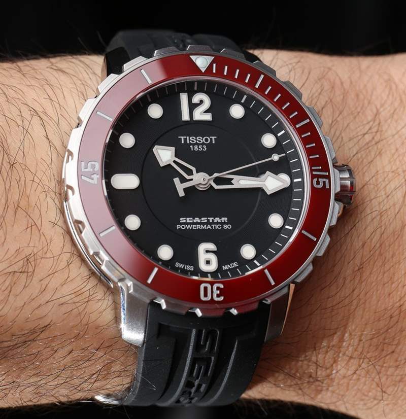 如果將 2013 年和 2014 年的 Seastar 1000 手表并排放置,需要一分鐘才能看出兩者之間的差異。不過有很多。讓我們從擋板開始。2014 年,天梭為 Seastar 配備了陶瓷表圈嵌件,有藍色、黑色和栗紅色可供選擇。當然,后者賦予腕表黑色和紅色調,類似于非常時尚的帝舵Heritage Black Bay。實際上,陶瓷表圈插件相當不錯。它們不僅僅是一個扁平的環,而是在表圈與表盤相接的地方稍微傾斜一點,標記實際上是切入表圈而不是印在表圈上。