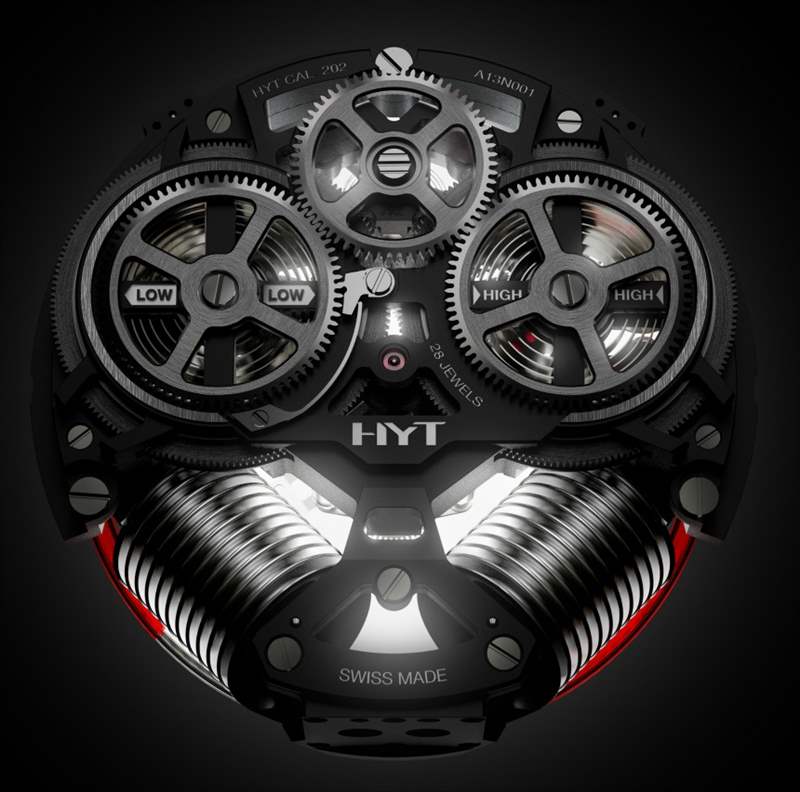 H2 的運動看起來像活塞發(fā)動機,是與 Renaud & Papi 合作生產(chǎn)的,盡管它們不涉及液體系統(tǒng)。它具有 192 小時的動力儲存,配備逆跳分鐘針,而小時則通過管中的藍色液體指示。基本上,您會查看小時刻度上液體線的終點。這是一個非常聰明且具有未來感的系統(tǒng),我們真的很欣賞。除了原來的綠色液體,HYT 開始展示一系列顏色,例如紅色和藍色——這些顏色都將在今年小批量展示。
