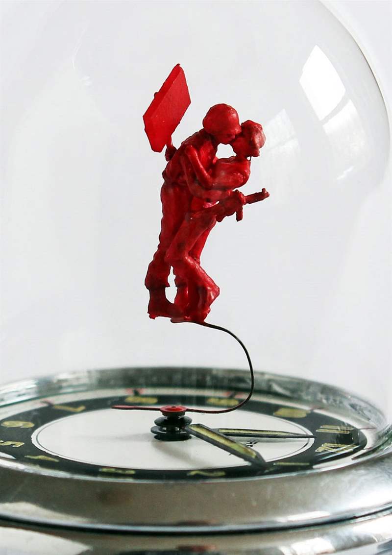 頂部的作品被稱為“Watch Sweeper”,有一個(gè)看門人清掃手表指針,因?yàn)榭撮T人自己附在一只移動(dòng)的手表指針上。下面是一段視頻,展示了各種手表雕塑的動(dòng)作,然后是“年輕素食者的歷險(xiǎn)記”,其中有一個(gè)屠夫在一個(gè)年輕女孩的手中拿著一把屠刀,還有一頭豬被圍繞表盤(pán)旋轉(zhuǎn)的氣球高高舉起。在下方,您會(huì)看到一名士兵在名為“愛(ài)與抗議”的作品中親吻一名戰(zhàn)爭(zhēng)抗議者。