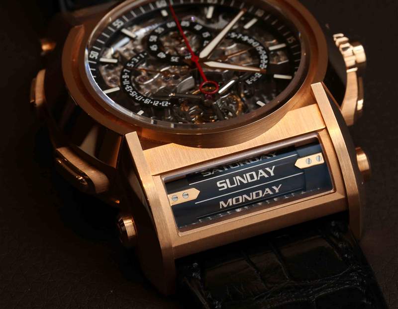 滾輪是第一章模型如此龐大的原因之一。滾輪主要由鋁制成,是該系列設計 DNA 的重要組成部分。它們用于在手表的頂部指示月相,在手表的底部指示星期幾。Chapter One 手表的另一個獨特之處(我認為其他任何手表都不存在)是按鈕中的特殊安全桿。推動者不是第一章所缺乏的東西。實際上,整個案件中有五個。