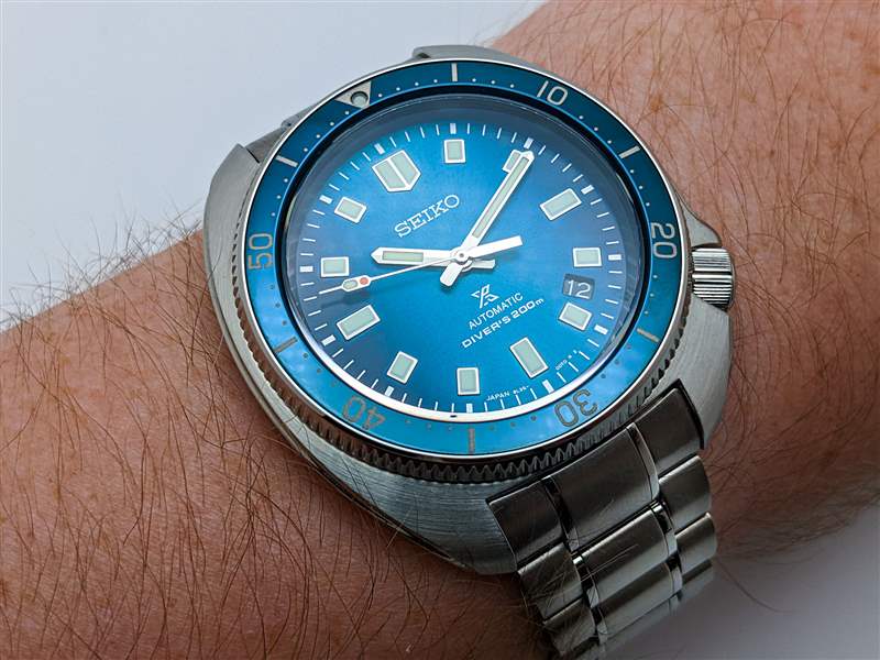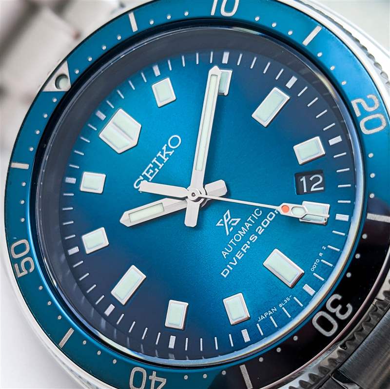 Seiko 因其在其整個型號系列中打造極具吸引力的表盤而享有盛譽,但即使按照該品牌自己的標準,Prospex SLA063 的表盤也是真正的佼佼者。SLA063 的調色板旨在喚起北極光的發光、空靈的色彩,立即將自己從 Prospex 系列的其他產品中脫穎而出,這種動態外觀是多級精加工工藝的結果。首先,該品牌在這里使用了一種非正統的漸變效果,表盤的邊緣在 3 點鐘和 9 點鐘位置漸變為深午夜藍色,與從 12 點鐘方向延伸至 6 點鐘方向的較亮條紋形成鮮明對比。接下來是經典的旭日形效果,具有適度的顆粒感和寬廣的動態范圍。在此之上,精工在表盤表面添加了淡淡的波紋紋理,這有助于在視覺上柔化旭日紋理的邊緣,使其更像北極光的幽靈般纖細的外觀。當然,最引人注目的元素是表盤顏色本身。這種豐富、細膩的藍色色調在不斷變化的光線下顯示出多種多樣的陰影變化和底色,從近乎黑色到鈷藍色、綠松石色,甚至淡綠色。這是一種閃閃發光、復雜的色調組合,很難在相機上捕捉到,但在實踐中立即引人注目。這種對細微差別的承諾也延伸到 SLA063 的表盤文字和外部分鐘軌道,采用精致的金屬銀色印刷呈現,為手腕上的表盤增添了額外的光彩。表盤布局本身的其余部分大多遵循熟悉的“Willard”圖案,忠實再現矩形應用索引,6105 獨特的指揮棒聽筒和一眼就能認出的“紅綠燈”秒針上的變化。精工將 SLA063 的日期窗口移至 4:30 位置的決定可能會引起爭議,但這種偏離中心的位置有助于在視覺上保留索引的布局,而黑色日期輪則讓這個元素在看時或多或少地消失撥號。