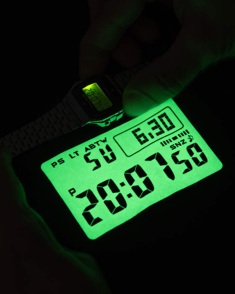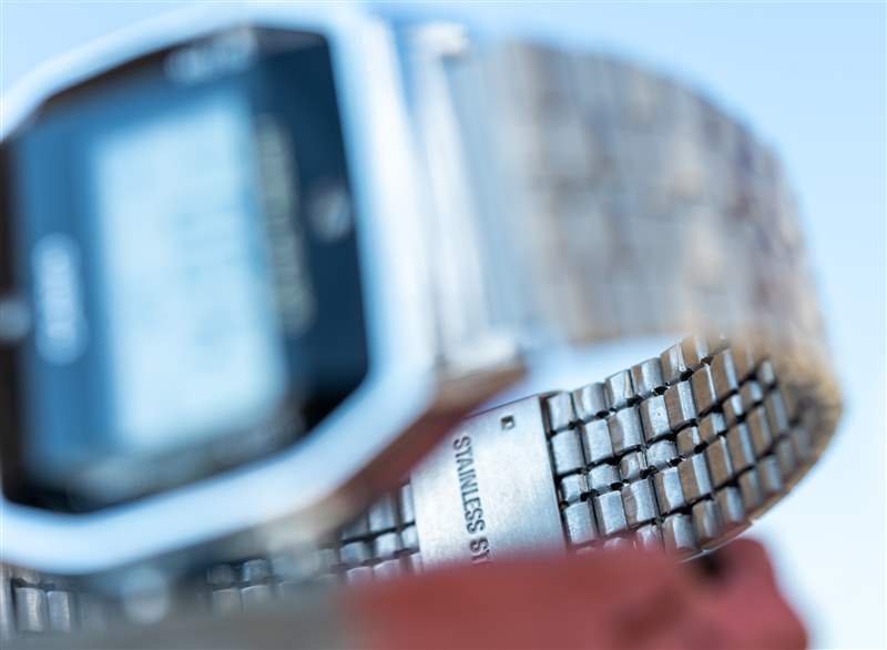 方形 LCD 顯示屏既復古又清晰易讀。它非常清晰(即使在某些照片中,顯示器的活動部分和非活動部分之間的對比度似乎較低)。事實上,這是我目前擁有的最清晰的手表,以相當大的優勢贏得了這場相當重要的比賽。到了晚上,隱藏在顯示屏左側的可笑的壞“LED”燈清楚地提醒了 35 美元的價格標簽:它微弱的綠光幾乎沒有到達小時顯示,有一些光滲漏到紀要。公平地說,當環境太暗以至于沒有燈的幫助就無法讀取顯示時,時間可以完整讀取——但在黃昏或光線不足的樓梯上,您可能會錯過一些不錯的舊 Super -LumiNova,或者更準確地說,