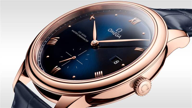 與之對應的男表選擇頗多,比如碟飛系列第三代典雅腕表41毫米,由偏紅的 Sedna 18K金制成。這是一種呈現熾烈色調的18K玫瑰金,同樣由歐米茄獨家研發制造,其獨特成分包括銅和鈀,以確保顏色持久和穩定。這一新型合金的名稱源于被天文學家稱為 Sedna 的外海王星天體,Sedna 小行星被認為是太陽系中表面顏色最紅的天體之一。拱形的深藍色 PVD 表盤呈現出太陽射線的打磨效果,柳葉形時分指針及6點位的小秒針經 Sedna 18K 金 PVD 處理,羅馬數字刻度和弧面形小時刻度交替出現,特別文質彬彬。