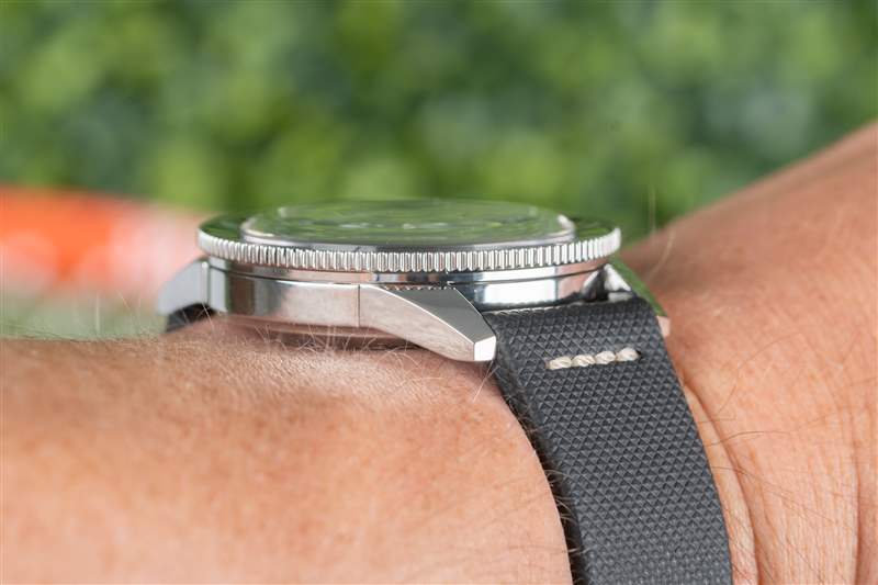 庫克船長系列的標志是其體育場表圈。硬幣邊緣經過完全拋光,綠色陶瓷嵌件也是如此,其上刻有 Super-LumiNova 填充標記。與扁平邊框類似,但外觀更酷,這種風格最大化了握持面積,同時最小化了高度,而更常見的凸形邊框通常會導致更高的高度或更少的握持力。可以肯定的是,卡梅倫諾里庫克船長通過了我嚴格的表圈測試:當我的手和表圈都是濕的時(在我兒子洗澡時和在海里時),我能夠旋轉它。高度的比例優勢也很明顯,腕表厚度為 12.3 毫米,佩戴起來非常舒適,尤其是對于 42 毫米、300 m WR 腕表而言。雖然它不是瑞士 300m 跳水運動員中最瘦的,但它擊敗了歐米茄海馬和勞力士潛航者,前者的表圈在潮濕時毫無用處。